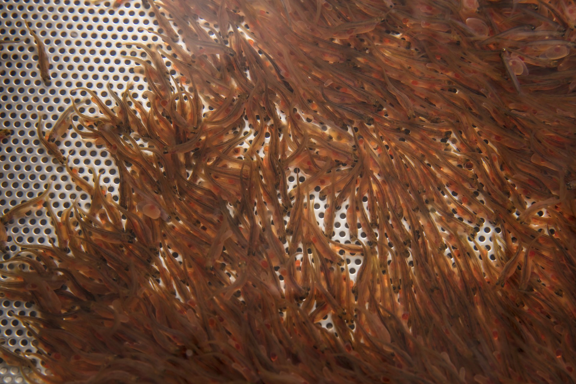 Nach zwei Monaten ziehen die Lachse in eines der nächstgrösseren Becken um. Ihre Kindheit verbringen sie wie in der Natur – im Süsswasser. Hier schwimmen sie in Schwärmen und kriegen das erste Mal Fischfutter. Mit zunehmender Grösse werden sie auf mehrere Becken verteilt, die mit einem Netz zugedeckt sind. Diese dienen zum Schutz, damit die jungen Heranwachsenden nicht heraushüpfen. Von null auf 150 Gramm brauchen die Junglachse zwölf Monate.