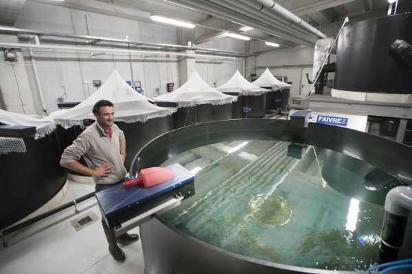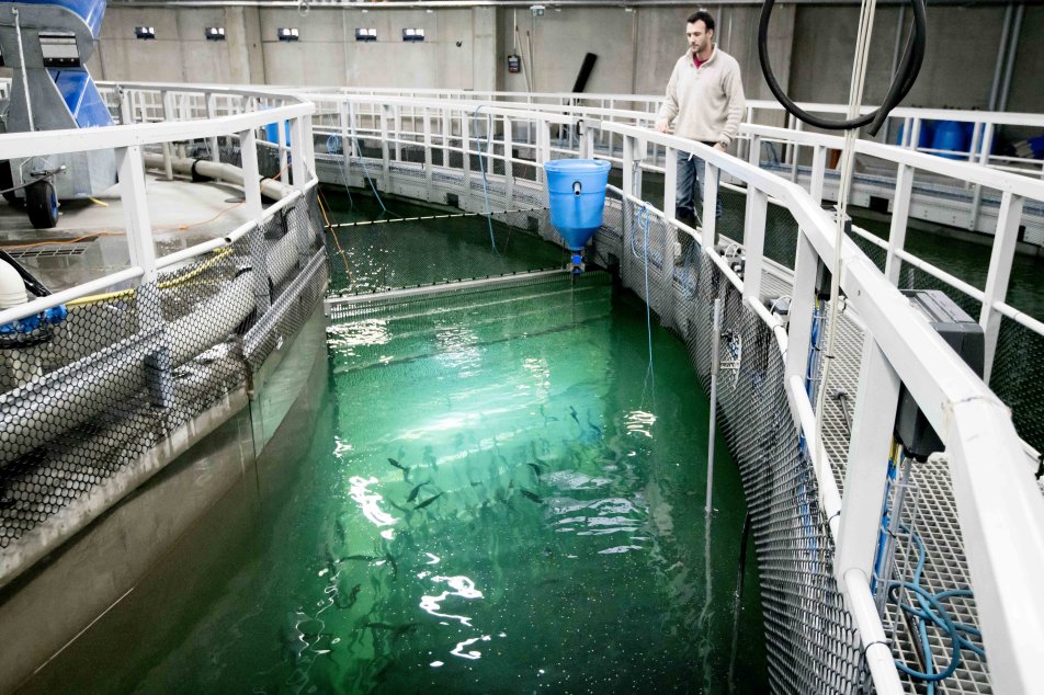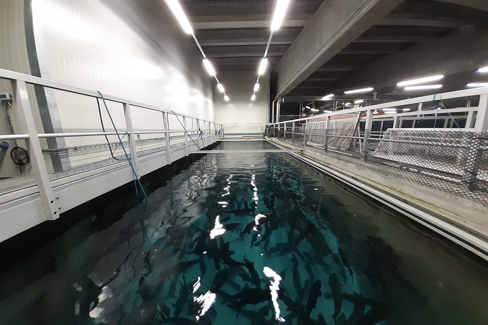 Nach einem Jahr ziehen die Lachse weiter ins Rundbecken. Dieses weist mit 32 Metern Durchmesser, sechs Metern Tiefe und 5400 m3 Fassungsvolumen eindrückliche Dimensionen auf. Während die Junglachse in der Tiefe jagen oder sich im Strömungsschatten ausruhen, schwimmen die grösseren Fische nahe der Wasseroberfläche gegen die von Propellern erzeugte Strömung. Die Fütterung ist vollautomatisch und auf einen Turnus von dreissig Minuten programmiert.