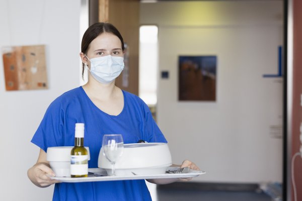 Auf den Patientenzimmern: Momentan bekommen privat Versicherte Wein auf Verlangen. Allgemein Versicherte bezahlen dafür einen Aufpreis. An Events bieten wir teilweise auch Wein an.