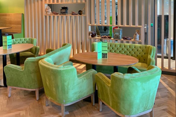 Près de la zone industrielle d'Uetendorf se trouve un bâtiment aux allures industrielles, rehaussé de notes vertes rafraîchissantes. À l'intérieur, les tons verts mêlés au bois et à l'anthracite créent un mélange harmonieux. En mars, la confiserie Steinmann a emménagé sur les 1600 mètres carrés de l'ancienne imprimerie, car elle commençait à manquer de place à Thoune. Loin de la ville, en dehors de l'agglomération. Une décision audacieuse qui porte ses fruits. Pendant qu'on s'active en cuisine, le client peut faire son choix parmi une offre variée à tout moment de la journée: un petit déjeuner roboratif le matin, des menus préparés sur place qui changent tous les jours le midi et des spécialités de pâtisserie l'après-midi. Très rapidement, l'offre du Top Café Steinmann a conquis les collaborateurs des entreprises locales comme les familles avec enfants. Les plus jeunes peuvent se défouler par tous les temps, que ce soit sur l'aire de jeux extérieure couverte ou dans le grand espace de jeux intérieur. Et le concept est un succès: les propriétaires Barbara et Marcel Steinmann et leur équipe font salle comble.