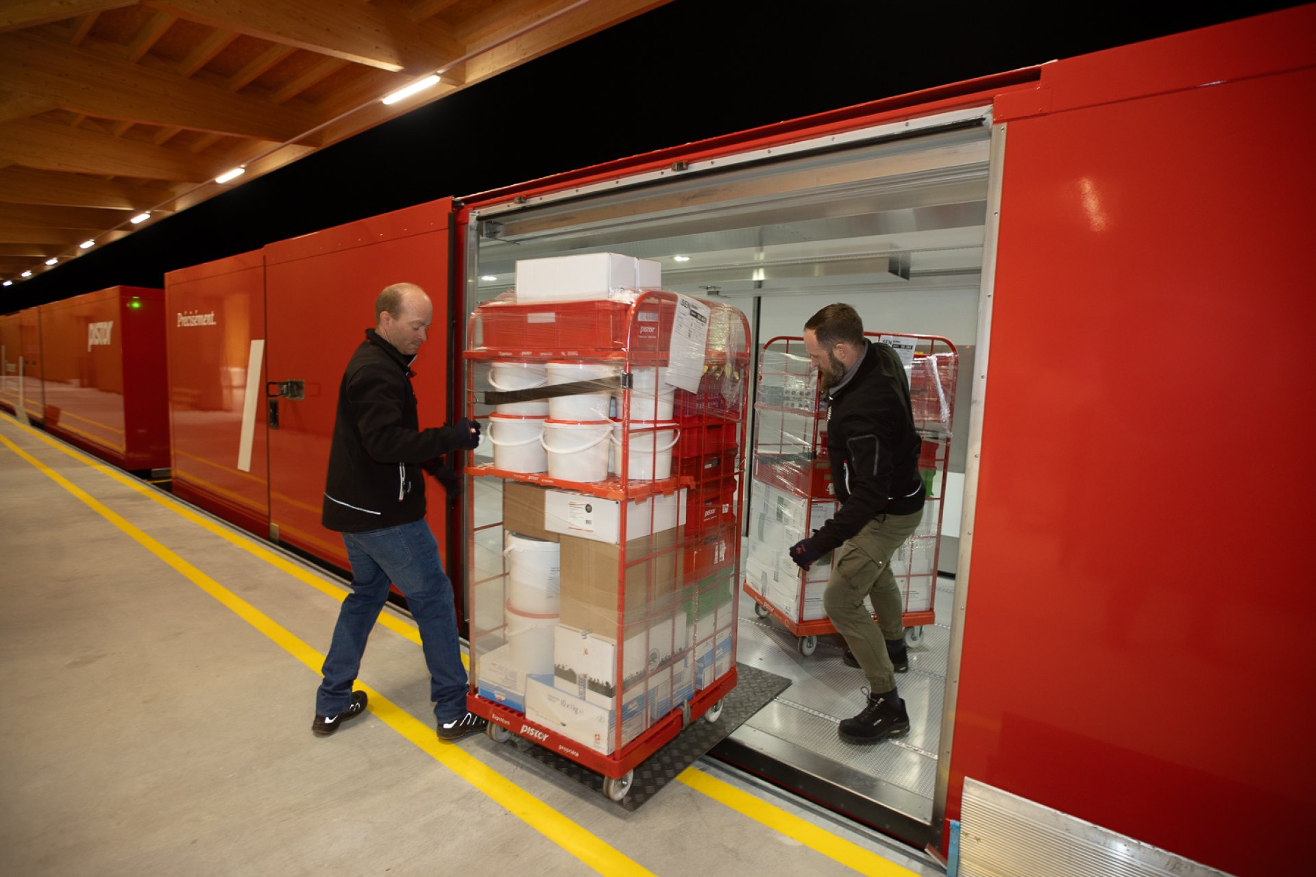 Les marchandises sont transportées par train pendant la nuit du siège de Pistor à Rothenburg, dans le canton de Lucerne, à Sennwald. Cela se traduit par une économie de plus de 400 000 kilomètres par route chaque année. Nous utilisons par ailleurs des containers ferroviaires équipés d’un système électrique de refroidissement sur batterie au lieu de systèmes de refroidissement conventionnels fonctionnant au diesel. À Sennwald, les marchandises sont ensuite chargées dans des camions tôt le matin et distribuées aux clientes et clients.